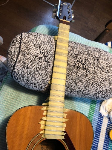 FG130が送られてきてから一週間が過ぎました。張られていた弦は結構新しいものでしたが、お掃除ついでに交換します。マスキングテープを貼ってフレットを100均で買ったサビ落としで磨きました。指板はオレンジオイル、ペグはこれまた100均のシリコンスプレーをさしました。ちなみにボディ、ヘッドは送られてきた状態では結構汚れており(古いYAMAHA特有の白濁かと思っていました)濡れた雑巾で擦ったら落ちたのでその後乾かしてオレンジオイルで磨いたらピカピカ✨満足です。