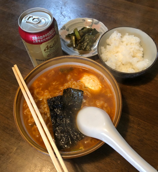 一週間程前にテレビを見ていたら取り上げていて、美味そうだなぁとは思っていたんですが、わざわざ買おうとまでは思いませんでした。でも近所のスーパーへ行ったら売っていて、一回食べてみようと嫁さんと相談して(インスタントラーメン買うくらいで相談しなくても、なんですけど)買ってみました。なかなか食べる機会が無かったんですが今日遂に!(そんな大げさな物でも無い)先に嫁さんと息子が食べていて感想がめっちゃ辛いと?(そりゃ袋に辛と書いてあるから辛いやろ?)作り方を丁寧に読んで作って実食!(実は先日息子が作ったヤツのスープを少し飲んだ時に味が少し薄く感じたのでお水を 50cc、袋の作り方より少なめにしました)