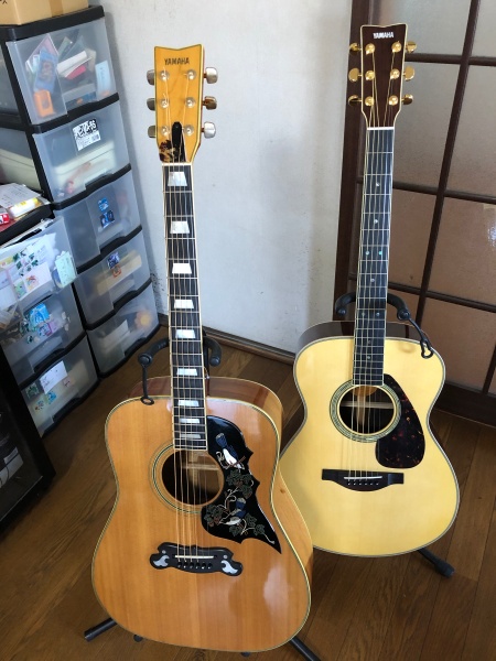 友達のYAMAHA L-12SN 、約40年前のギターです。L-Seriesの中でも珍しいギブソン風のデザイントップにスプルース単板、サイド&バックにアフリカンマホガニー単板を使用したオール単板ボディ。何十年ぶりに弾きましたが昔弾いた感じの記憶と全く違っていて凄く弾きやすい。ネックが三角タイプで自分のLSと全く形状が違います。(LSはかまぼこ型)音もシャキシャキ感があってGood! 昔のYAMAHA Lシリーズに俄然興味が湧いてきました。 FGシリーズもそうなんですがYAMAHAの昔のギターの種類分けが今ひとつ不明なんで調べてみようと思います。ってやっていると欲しくなってきてドンドン深みにハマって行く、ギターあるあるですよね?