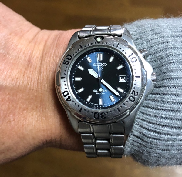 この時計を買ったのは1999年5月、そう後2ヶ月後に人類が滅亡するかも?って時でした。(買った時計家さんは今はもう、ありません)電池を交換するタイプの時計は嫌だったのでキネティック方式という自動巻ではなく自動充電(時計を振ることによって中の電池に充電される方式)です。