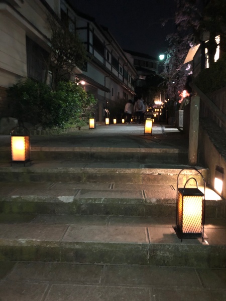 行燈を両側に灯してくれているので情緒があります。凄く良い雰囲気? ここは有名な写真スポットなので、三脚を構えて撮っている人も結構多いです。この坂を登ったところに有名な枝垂れ桜が咲いています。