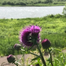 アザミ、土手にいっぱい咲いています。キラキラ光る川面と合わせてパチリ。こんな写真を撮れるのもポタリングの良いとこです。