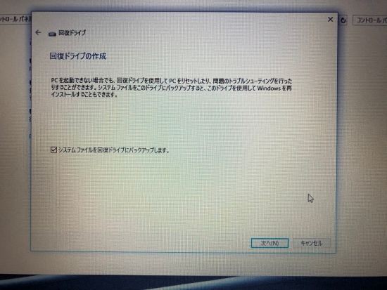 「システムファイルを回復ドライブにバックアップします」にチェックして
