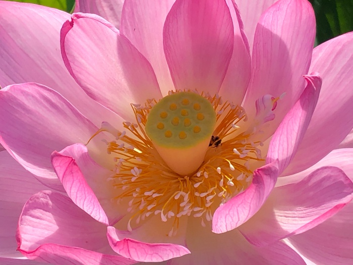 野菜のレンコンはこのはすの地下茎の事ですが、はすには花を愛でる観賞用と、野菜として食べる食用があります。という事で、お花の真ん中はレンコンに似ていますね。甘い香りがします。虫は蜜を吸っているのでしょうか?