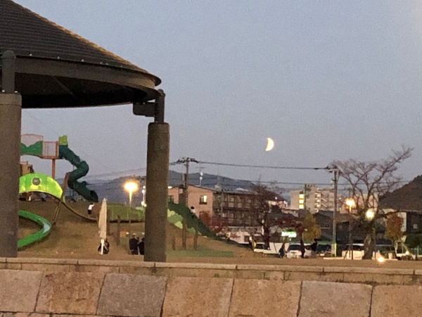 今回の月食は月の出から欠けています。初めて見ました。遠目にはただの三日月に見えますね。