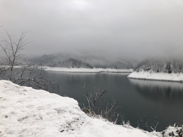 九頭竜ダム湖。スリップして落ちたら春になっても見つからなさそう? アスファルトが見えないくらい雪が積もっているので更に安全運転を心がけます。