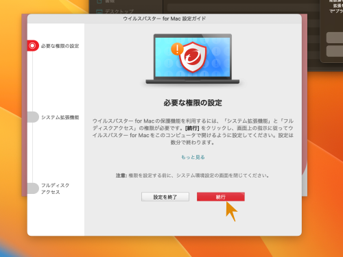 Macを立ち上げたらウィルスバスターのアイコンに注意のマークが出ています。