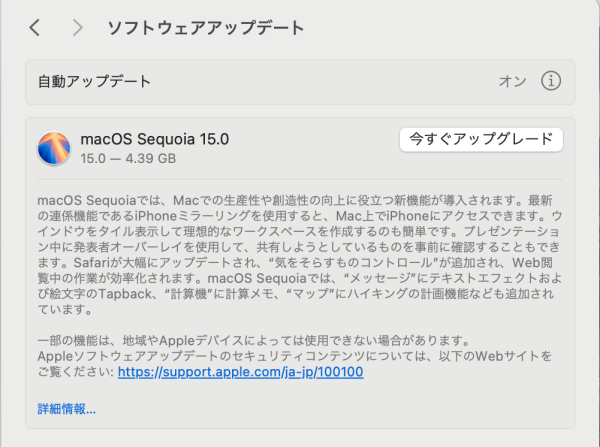 中秋の名月でもあるし、Sequoia (セコイア)の大きな新機能であるiPhoneミラーリングを早くやってみたくて、早速アップグレードする事にしました。