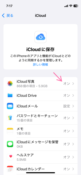 そうすると、『iCloud写真』がONになっています。コレは買った当初からONになっていて、何も触らなければ撮った写真がどんどんiCloudに溜まっていって、ある日『iCloudの容量が残り少なくなりました』の通知が来て(5GBは無料)あわてて容量を増やす事になります。(自分の場合の話)