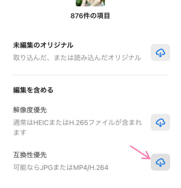 なので、iCloudの写真→PC→外付けHDDと一手間掛かる方法でやってみました。