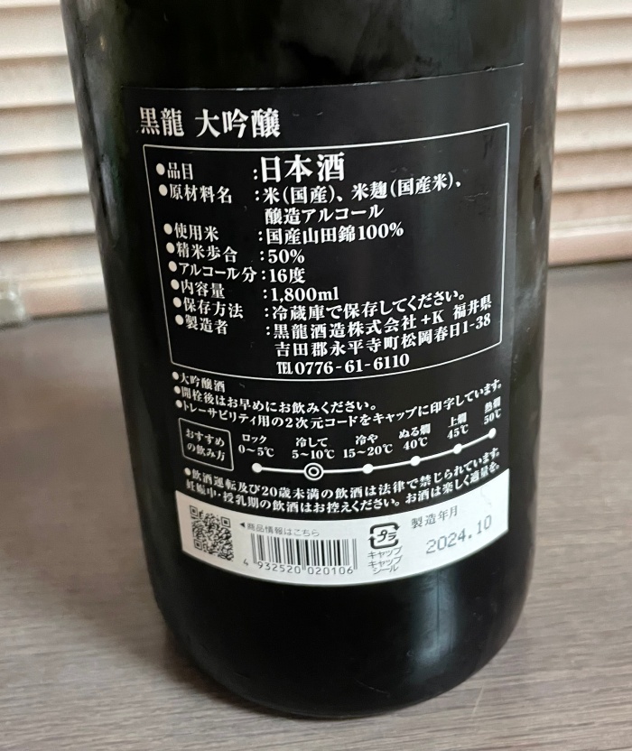 福井県で最も有名なお酒とも言える「黒龍」を貰いました。