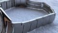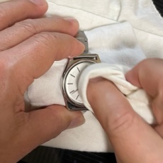 磨く前に必ず、バンドで裏蓋が傷つくのを防止するため、柔らかい布などを時計に挟み込む。