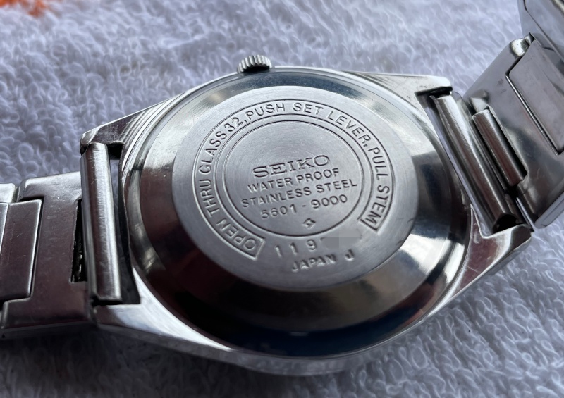 ちなみに5601-9000の品番の意味は、最初の2桁(56)がムーブメント番号、3文字目がグレード番号(0=ロードマティック、2=キングセイコー、4=グランドセイコー)、4文字目がカレンダー番号(1=ノンデイト、5=デイト日付、6=デイデイト日付曜日)、最後の4桁がケーズ番号(初期型は下1桁が0、モデルチェンジすると1とかに増えていくようです)