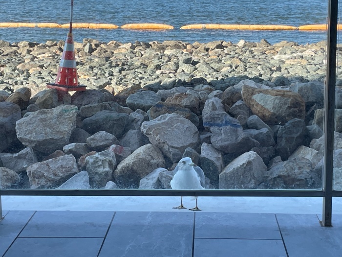 ホテルへ着いて、一服。カモメがエサをねだりにやって来ます。